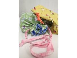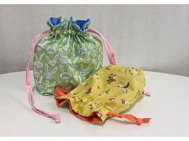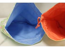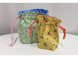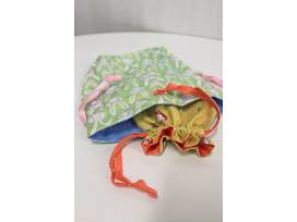 Set of two bags, one large and one small. Reusable fabric drawstring bags made with spring fabrics. The smaller bag has blue drawstrings