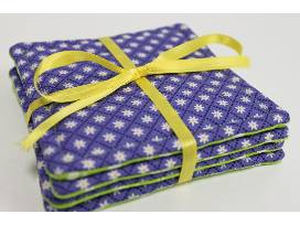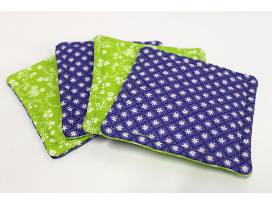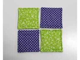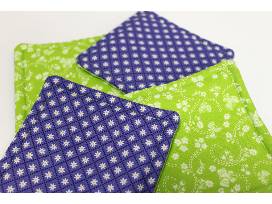 Set of four reversible fabric coasters made with green and purple floral cotton fabric.
