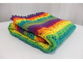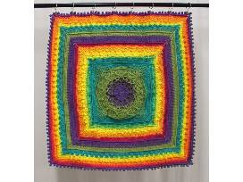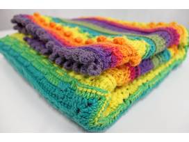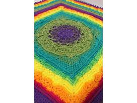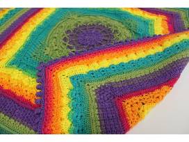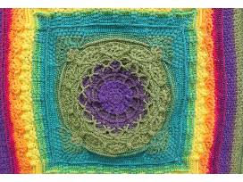This baby blanket is designed with a small mandala, which is squared off. It is made with lots of textured and pretty stitch combinations including a cute pom pom border.
