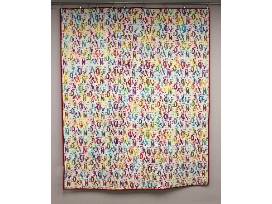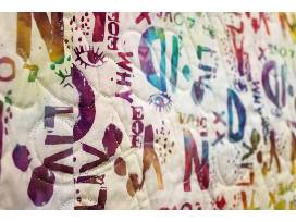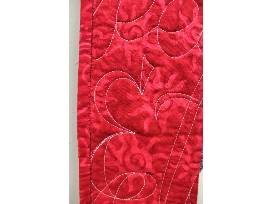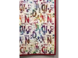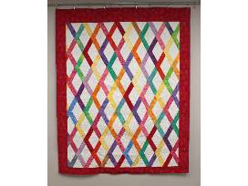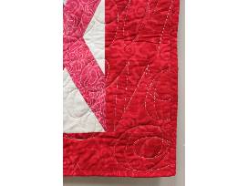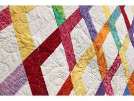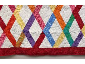 Simple rhombus shape sashed in a rainbow of colors. Look closely at the quilting to find the message "All you need is love & Tacos".