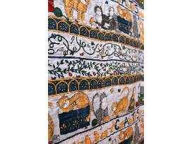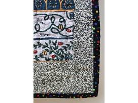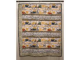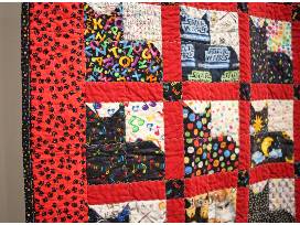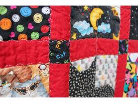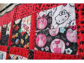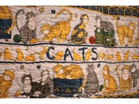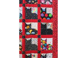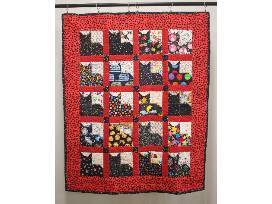 This is a quilt for everyone who loves cats. The 20 cat quilt blocks are made from black prints, the border is red with black paw prints, and the back is a cat panel. Suitable to tuck around a young child, or as a wall hanging.