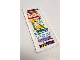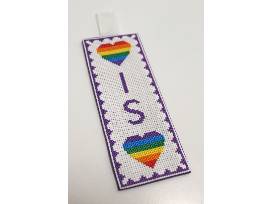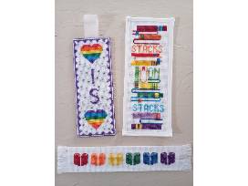 Three cross-stitch bookmarks finished so the stitching is not exposed. Rainbow Books design from "Lit Stitch" by Book Riot. Stacks on Stacks design adapted from "Lit Stitch" by Book Riot. Love is Love design adapted from NotoriousNeedle.com.