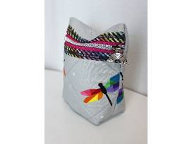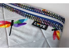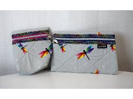 Cute pair of small pouches with rainbow binding, rainbow dragonflies, and rainbow zipper pulls.