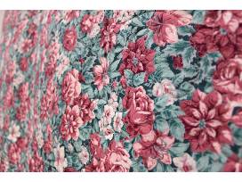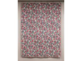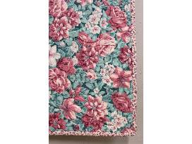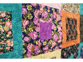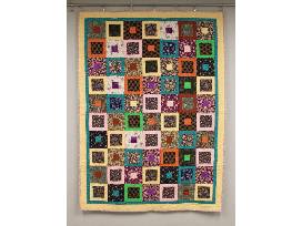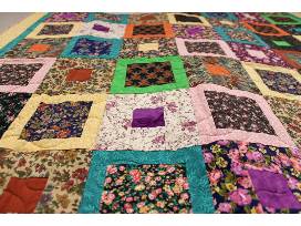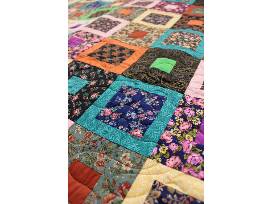 This quilt features a colorful array of solid, floral, and other patterned squares. The back is green and mauve floral.
