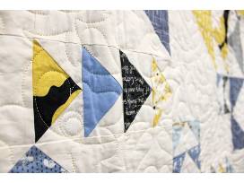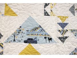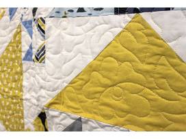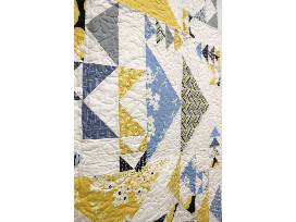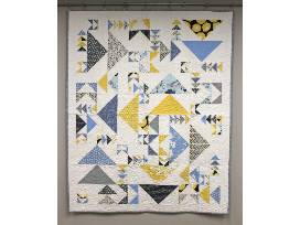 This design is called Flight Club. It features tastefully arranged triangles of various patterned fabrics in blues and yellows.