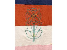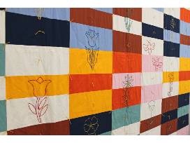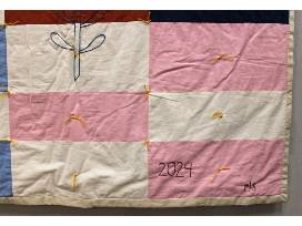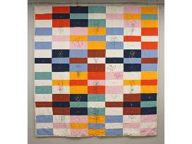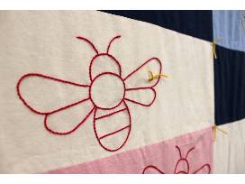This colorful quilt was a collaborative project made across two different states with the help of three friends. Colorful hand-embroidered flowers cover the quilt top together with pollinator friends - the butterfly and bees. The hand-tied finish gives the quilt a soft and cozy feel and the embroidery was done by hand and the quilt was finished by hand tying with yarn.