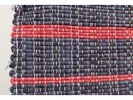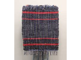 This woven rug is black denim with red stripes.