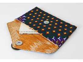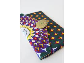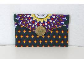 Wallet is fully lined and has interfacing to provide durability. Round vintage button over magnetic snap. Outer wax fabric from Malawi, Africa.