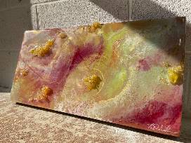 Immerse yourself in the captivating beauty of ""Inherited Heart,"" a 12x24-inch masterpiece that transcends boundaries. This mixed media artwork, elegantly housed on wood, combines fluid art, resin work, and iridescent paper sculpture to create a symphony of expression. Inspired by poetry by Kylie Johnson, this piece invites you on a journey of self-discovery. Bid now to add this ethereal masterpiece to your collection!