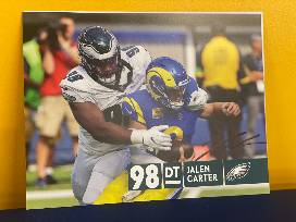 For any Eagles fan, this Lineman Autograph Bundle is nothing short of a touchdown! This unique set includes: A signed photo of Eagles' star Defensive Tackle, Jalen Carter. Known for his powerhouse plays and game-changing tackles, Carter's autograph is a must-have for any true fan.