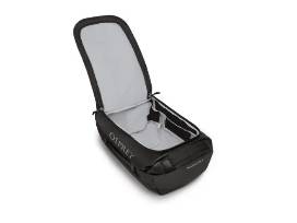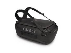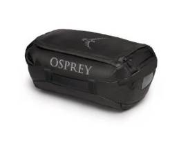 Black Osprey Transporter 40L Duffel. Featuring rugged, weather-resistant fabrics that keep internal contents protected and a stowaway harness that carries comfortably. Perfect for gear storage or as a companion on a trip with a coating that protects your gear from the elements.