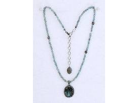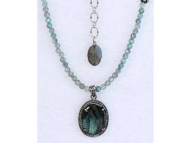 This exquisite piece of handcrafted jewelry showcases faceted Amazonite in vibrant hues that capture the eye. The Amazonite is complemented by a captivating Labradorite pendant encased in gleaming sterling silver. The pendant is adorned with delicate diamond accents that enhance its elegance and sophistication and showcases a natural inclusion drawing your eye through the center line.