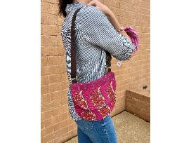 This Sari Bari bag, made from recycled saris, is handstitched in the Kantha style by a trafficking and commercial sex trade survivor. It is "signed" with love by the artisan.