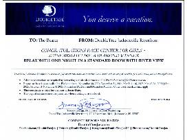 Gift Certificate for one night stay at Double Tree Jacksonville Riverfront. Enjoy the river view from your room. Blackout dates apply. Expires 11/9/2025