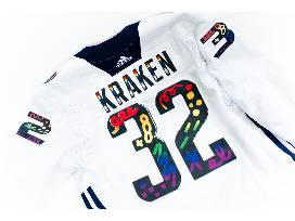 Specialty Kraken Jersey Designed by Nikita Ares in honor of Pride Night on March 28th, 2024. Crested with player's name & number, signed by #24 Jamie Oleksiak, size 58+.