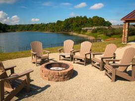 Shared amenities for guests of Straker Lake cabins include a fire pit, dining hall, playground, athletic courts, and more!