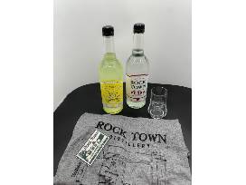 -(1) 750mL bottle of Rock Town Vodka, (1) 750mL bottle of Rock Town Lemon Vodka, (1) piece of branded glassware, (1) sticker, and (1) large T-shirt.