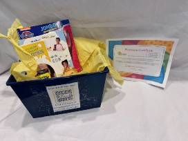 In addition to the Special City Shop Birthday Party, the basket also contains a brand-new book and toy or activity from the Playseum Gift Shop.