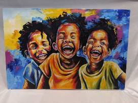 Original Oil Painting by Local Kenya Artist, Benson Kiruthu. The vibrant colors and joyful expressions of the children will bring a smile to any viewer! This young, talented and upcoming artist loves his work and is a mentor to other artists. He owns his own shop in Naivasha where he sells his paintings, as well as products from other artists.