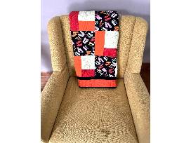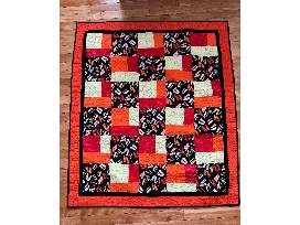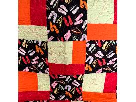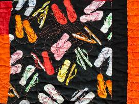 This one of a kind cheery quilt would accent any bed, chair or wall in your metro or lake home. Patterns of multi-colored sandals are nestled among orange, red and yellow colors with a solid black border. Solid Orange Color Back. Size 36 X 50 Inches.