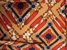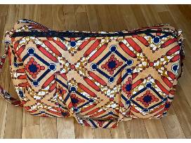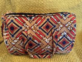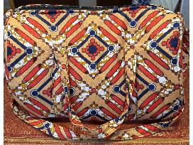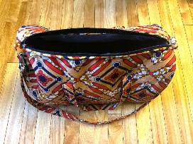 This colorful and beautiful African travel bag was handcrafted by Ester at Light of Hope, who serves as both Matron over the girls, as well as a skilled seamstress, making the girl's uniforms. This one of a kind item is made from best quality kitenge and khanga fabric in an orange and navy blue pattern. The bag has both hand straps and a detachable shoulder strap. Dimensions: 18 X 10 inches