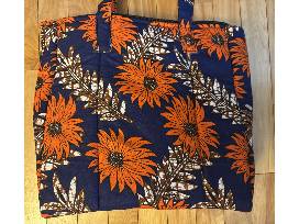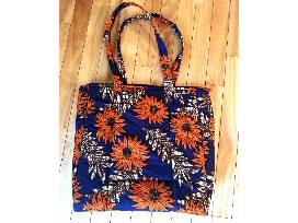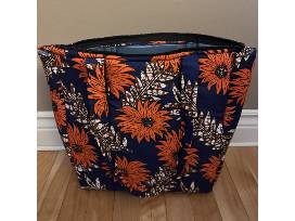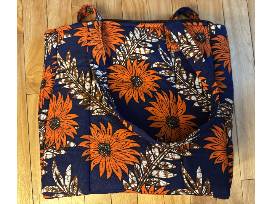 This colorful and beautiful African was handcrafted by Ester at Light of Hope, who serves as both Matron over the girls, as well as a skilled seamstress, making the girl's uniforms. This one of a kind item is made from best quality kitenge and khanga fabric in a bright floral orange and navy blue pattern. The bag has a 5 x 8 inch inner pocket. Dimensions: 12 X 14 inches