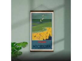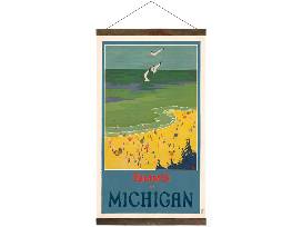 A beautiful replica of original artwork from a vintage advertisement featuring a Michigan beach scene. Perfect for a cottage or lake house!