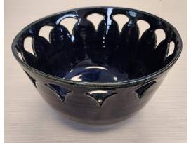 "This elegant ceramic bowl features a sleek, dark glaze with a deep midnight blue hue that radiates sophistication. Its scalloped edges and intricate cutout design around the rim make it a true standout piece. Whether used as a serving bowl, a decorative centerpiece, or a functional work of art, this versatile piece adds a touch of charm and refinement to any setting.