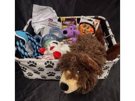 Pamper your furry friend with this thoughtfully curated dog lover's gift basket, packed with an assortment of fun and engaging toys to keep your pup entertained for hours! This paw-print themed basket includes a variety of high-quality plush, rope, and interactive toys, perfect for dogs of all sizes. Whether your dog loves to chew, fetch, or snuggle, this basket has something for every playful pup.