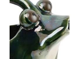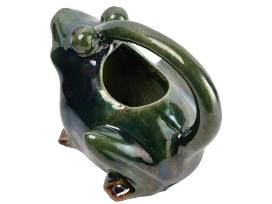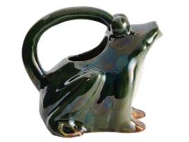 This whimsical stoneware watering pitcher features the silhouette of a frog with an integrated handle in a naturally variating reactive glaze. Display in a living space of any style from cottage to garden. Intended for decorative use only. Made from stoneware. 7.5" x 5.8"