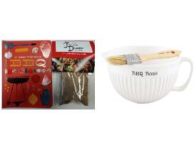 Ready to step up your BBQ game? This BBQ Boss set comes with a fluted ceramic sauce mixing bowl that has a handle. The bowl features the sentiment "BBQ Boss". The bowl comes with an engraved wood basting brush. The brush features the sentiment "Sauce-ome". Bowl 4" x 8" dia | brush 6 1/2"