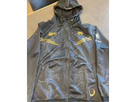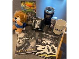 This package also includes 3 UFC hats, a UFC bucket hat, UFC 295 signed poster of Prochazka vs. Pereira, UFC glove signed by former bantamweight champion Holly Holm, UFC glove signed by former lightweight champion Charles Oliveira, UFC bear, Black Rifle Coffee & Mug, UFC portable wireless Bluetooth speaker, UFC Yeti Mug, UFC Pro V1x golf balls, Ringside by Marc Ratner, UFC 300 Notebook, UFC Venum Zip Up in size L, Orange UFC Travis Mathew Polo in size L, 1 L UFC shirt, 3 XL UFC shirts, 1 - 2XL UFC shirt, 1 S UFC shirt, 1 M UFC shirt, 1 L Blue UFC Sweatshirt and 1 XL Gray UFC hoodie.