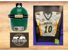 This package includes a MINI Big Green Egg with stand, a Black Leg Meats package of $200 worth of Bison and $200 worth of Beef, Two (2) tickets to the NDSU VS SDSU game on October 19th, 2024 at the Fargo Dome, an autographed jersey and a set of Bison coasters.