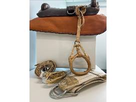 A typical horse saddle and stirrups used by gauchos throughout Argentina. Made entirely by hand using local materials, raw leather, sheep skin, and sheep leather achieving a comfortable and high-quality saddle for intense use. Includes leather saddle pad, embossed leather saddle with suede gullet, raw leather stirrups, straps, & girth.