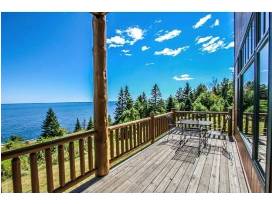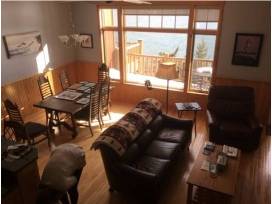 Kitchen table is in front of main window overlooking Lake Superior. There is door off living room to an outside deck overlooking the lake.