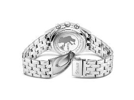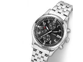 Stauer Split Second Noire Chronograph Men's Stainless Steel Quartz Watch with an elegant black face. The timepiece has a stopwatch function with three interior eyes and a date function.