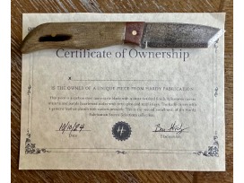 This knife is an orginal work by Ben Hardy, Bladesmith, and is the 2nd installment of the Hardy Fabrication, Sacred Selections colllection. The knife is a carbon steel tanto style blade with a stonewashed finish. It features a canvas micarta and Purple Heart scales wtih brass pins and stell inlays. The knife comes with a genuine leather sheath with custom artwork (notice the SS logo on knife and sheath). The overall length is 8.5 inches and signed. Knife aficionados will not want to miss this opportunity!