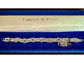 0Camrose & Kross JBK Bracelet Multi Color Stones and Faux Pearls. 7 inches long, with an extra link to add one inch. It alternates between silver with crystals and 2 rows of faux, tiny pearls. The center crystal stone colors are blue, green and purple. Never worn. Currently selling on Etsy for $59.