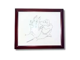 This unique artwork features a detailed illustration of hand placement on the sacrum-an essential concept in osteopathic diagnosis and treatment.