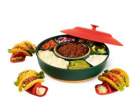 Taco Tuesday and Margaritas has never been more fun with this tabletop taco caddy, set of four Cantarito jars, and margarita salt.