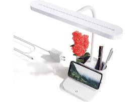 Brighten your workspace with a white desk lamp featuring a pen holder, dimmer, and phone stand, plus a Clutch portable iPhone charger to keep you powered up.