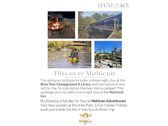 This getaway package includes a three night stay at the River Run Campground & Livery and two kayaks & one raft for the 7.5 mile trip on the river. Not a camper? This package also includes a two night stay at the Hemlock Inn.