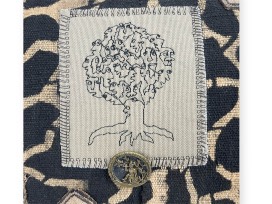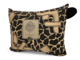 1Lee Small - Pillow. African strip-woven fabric, hemp Cuba cloth cutouts, and an antique button set off Machine People Tree by Paul Nosa. 16" x 18" x 6".