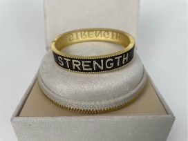 Freida Rothman - Strength Bracelet 2. An ode to female endurance and fortitude, Women of Strength honors the stories and sentiments of women that have shaped Freida as a mother, daughter, and designer. The Strength Bracelet is a .925 sterling silver core wide-hinged bangle bracelet. This iconic bracelet is designed in a finish of black rhodium and 14k gold.