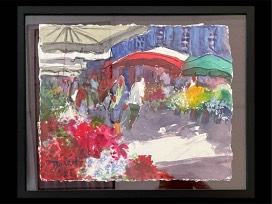 1Evelyne Boren - "French Market" - Watercolor. German-born Boren enjoys global recognition for her impressionistic interpretations of people and scenes of Europe, Mexico and the Southwest. The former stunt diver, who lives in Santa Fe, has more than 4,000 paintings in collections around the world. Includes a copy of Boren's book. 14" x 17" unframed.