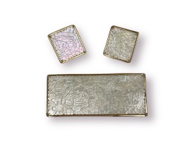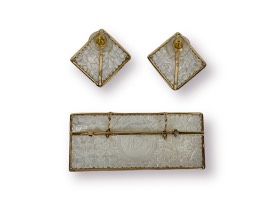 1Chinese Game-Counter Pin-Pendant and Earrings. This lovely suite is made from beautifully carved antique Chinese mother-of-pearl game counters; or possibly Victorian copies given the style of the script initials on the back, set in 14 KT gold. The carvings depict life in rural China. Ingeniously designed so that it can be worn on a string of pearls or as a pearl shortener for a longer necklace. This piece is donated in memory of Kit Herrod.