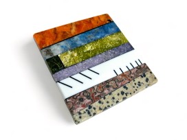 Mary Tafoya Mosaic Pin-Pendant. Mary Louise Tafoya Kewa produces contemporary versions of traditional Santo Domingo mosaic inlay work. From top to bottom, this piece features apple coral, denim lapis, serpentine, lepidolite, white clam shell and Dalmatian jasper.
