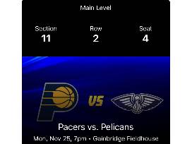 Two tickets to the Pacers vs Pelicans game on November 25, 2025 at 7 pm.