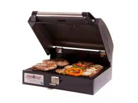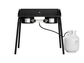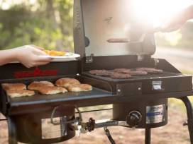 Make outdoor cooking easy with this Explorer 14 two-burner cooking system and a sleek BBQ grill box from Camp Chef. Portability is no problem with the removable legs and a three-sided windscreen.