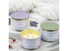3 Jars of 14-ounce jar candles with 4 wicks each in the calming scents of Lavender, Cherry Blossom, and Eucalyptus.